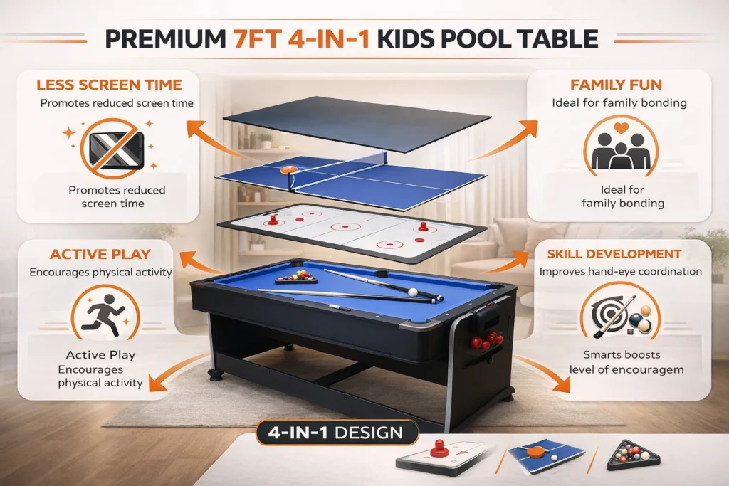 Our premium quality 7Ft 4-In-1 Convertible Pool Table combines pool, air hockey, and table tennis in one heavy-duty design. This variety ensures kids never get bored. One moment, they are lining up a pool shot; the next, they are enjoying a fast-paced air hockey match.